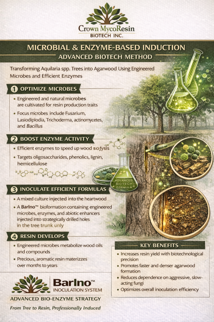 This method uses specific microbes and their enzymes to induce stress in Aquilaria malaccensis, triggering natural defense responses that result in resin production.
