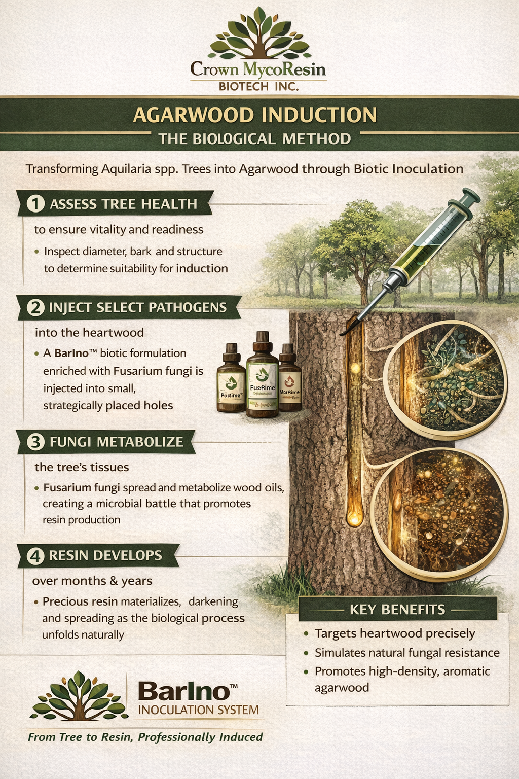 At the heart of this approach are beneficial fungi such as Fusarium oxysporum, microbial enzymes, and natural elicitors. These biological agents interact with the tree’s tissues at a molecular level, gently activating the genetic and biochemical responses responsible for creating fragrant oleoresin. The result is an induction process that feels natural — because it isnature, guided through science.