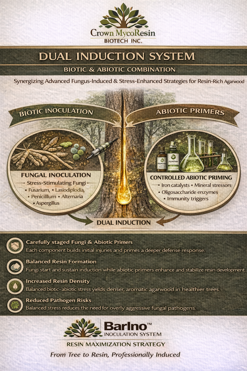 The Dual Agarwood Inducer System is an advanced induction method that uses two synergistic stress pathwaysbiological and biochemical—to stimulate natural agarwood resin production in Aquilaria malaccensis and related species.