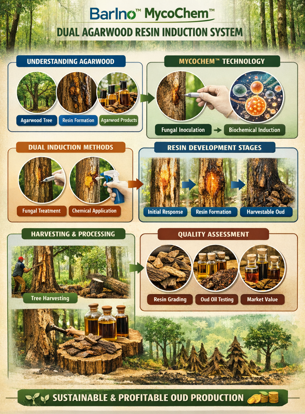 In the heart of sustainable forestry innovation lies BarIno™ MycoChem™, a breakthrough in agarwood resin induction. Born from decades of research in microbial biology, plant physiology, and chemical engineering, BarIno™ MycoChem™ is more than a technology—it’s a promise: to cultivate high-quality agarwood sustainably, ethically, and profitably.