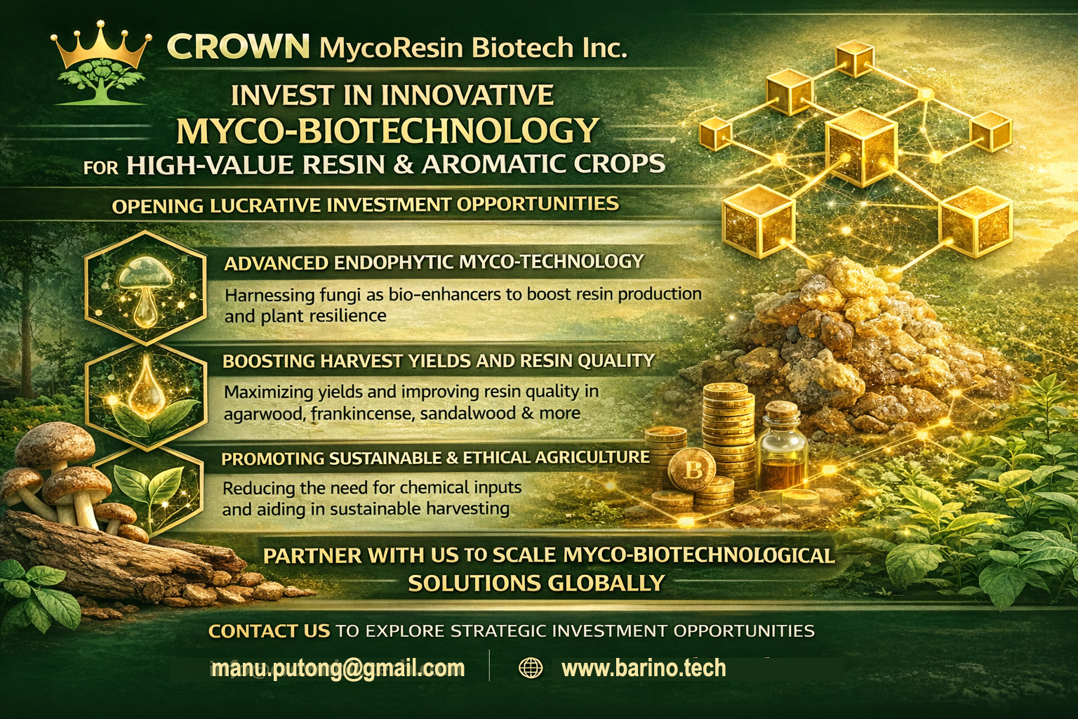 “Myco-biotechnology represents the next frontier in high-value crop production,” said Manuelito R. Putong, Founder & Chairman of Crown MycoResin Biotech Inc. “Our platform bridges laboratory science and real-world plantations, enabling sustainable, scalable, and commercially viable resin production aligned with global ESG and natural products markets.”
